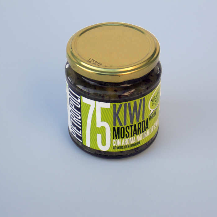 Die Kiwi Mostarda enthält Fruchtstücke und Saft. Dem wird nur natürlicher Senföl hinzugefügt.